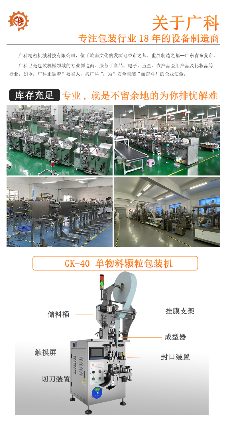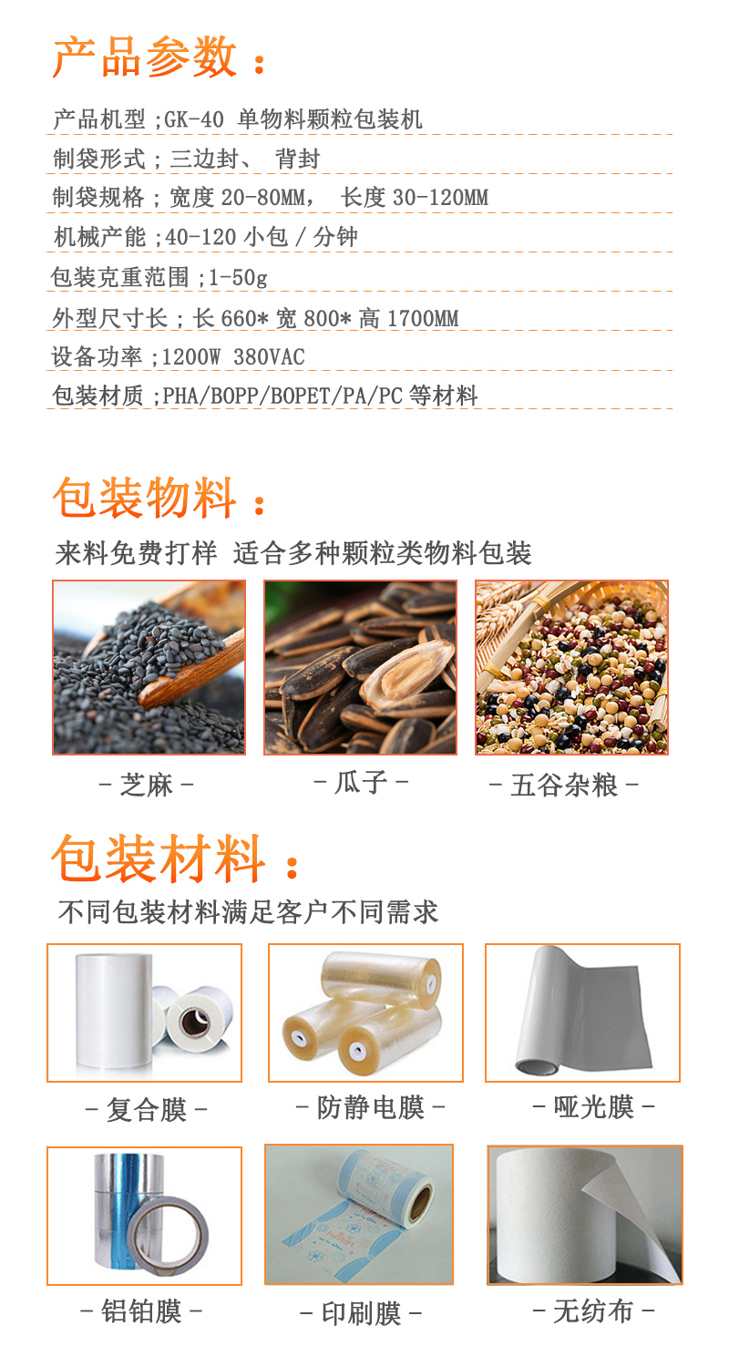 廣泛適用于食品類、五金類、農產品類、日化類、醫(yī)藥類等多個行業(yè)領域的顆粒類、不規(guī)則類產品的包裝